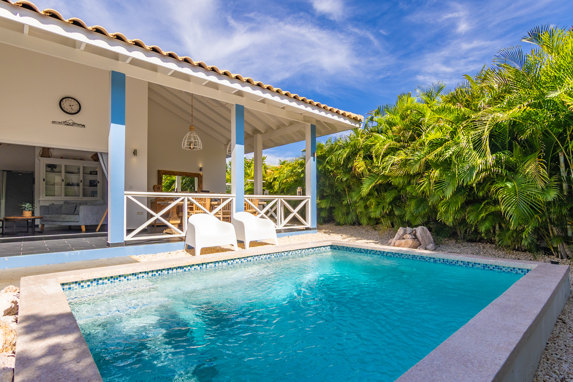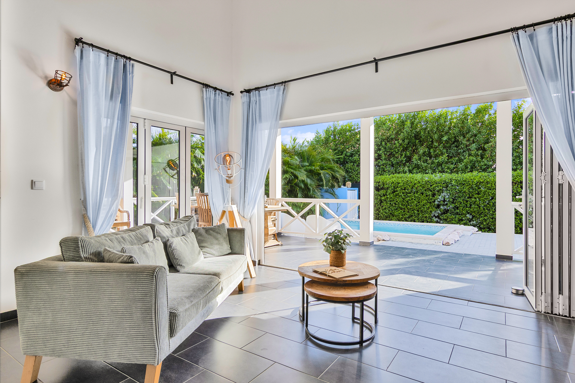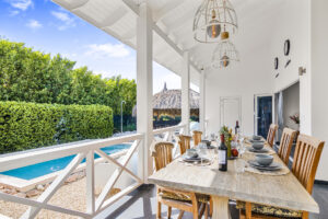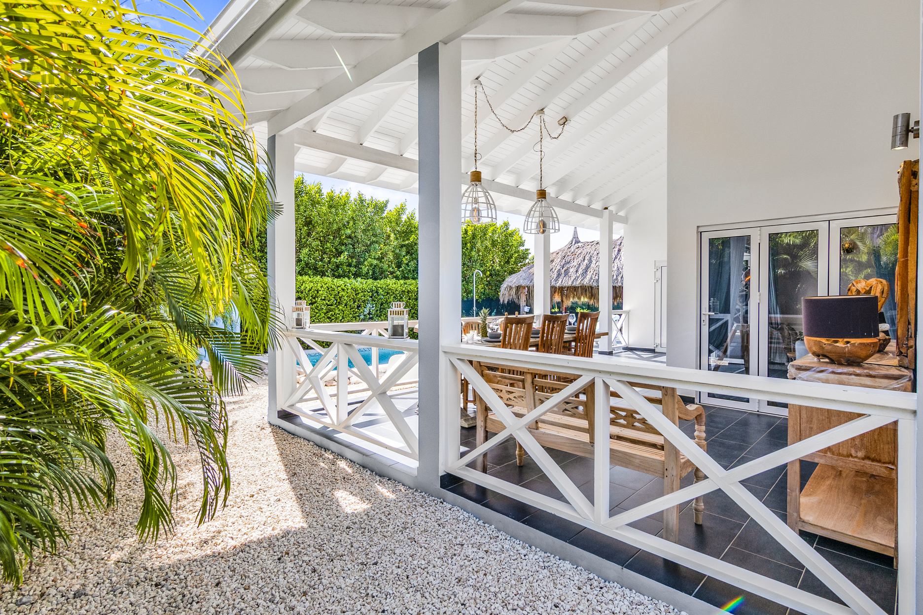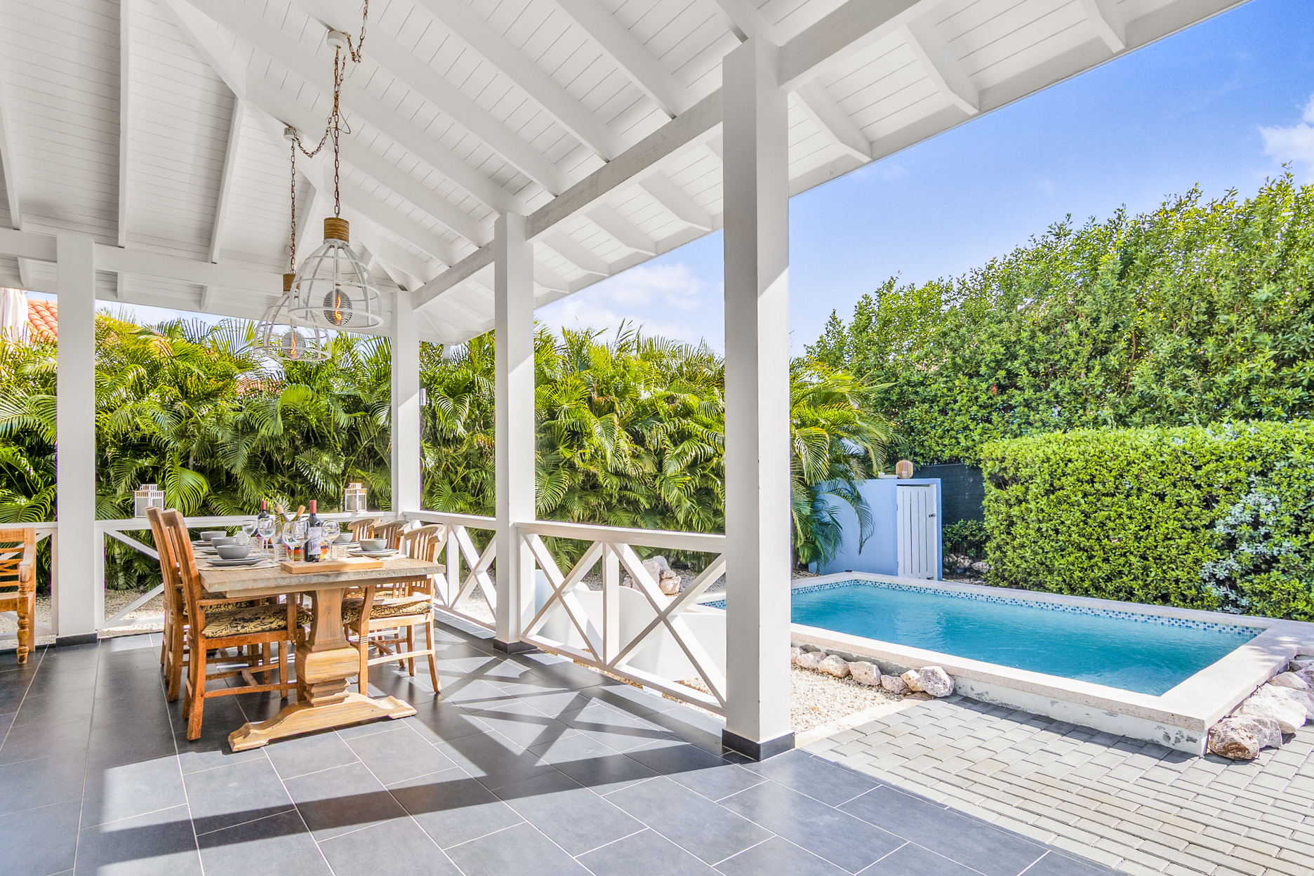 De villa is voorzien van een zeer ruime overdekte porch welke d.m.v. 2 grote vouwdeuren verbonden is met de woonkamer. Het is een heerlijke plek waar u aan de grote eettafel volop van de tuin en het zicht op het zwembad kan genieten. In de tuin bevindt zich het privé zwembad voorzien van ligbedden.