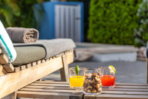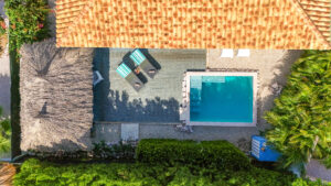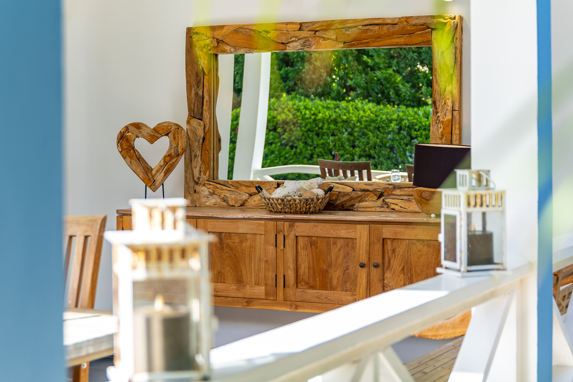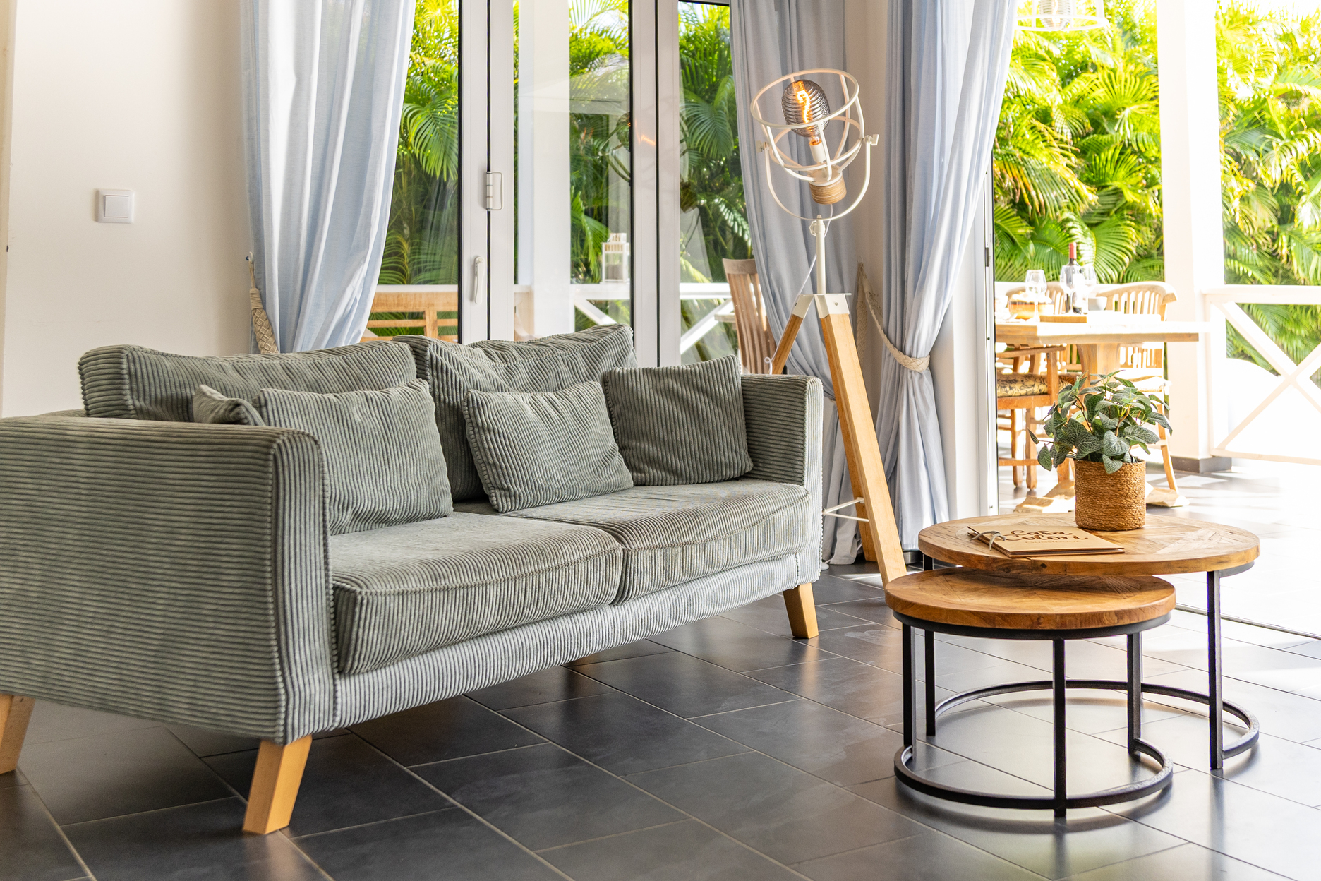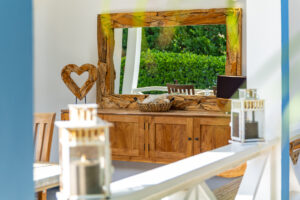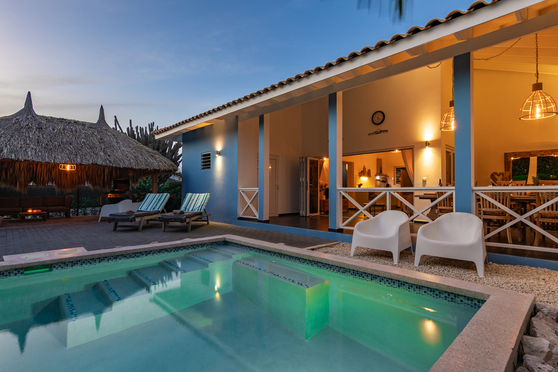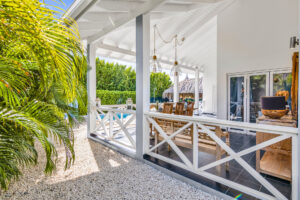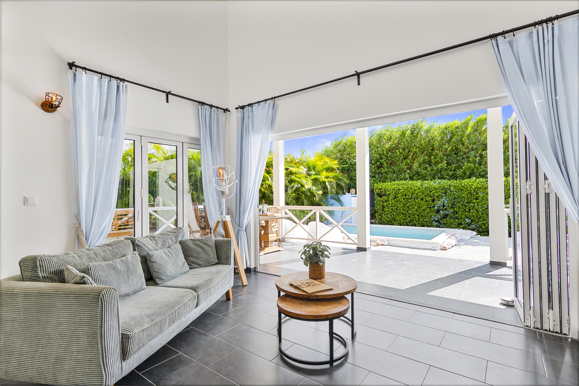 De villa is voorzien van een zeer ruime overdekte porch welke d.m.v. 2 grote vouwdeuren verbonden is met de woonkamer. Het is een heerlijke plek waar u aan de grote eettafel volop van de tuin en het zicht op het zwembad kan genieten. In de tuin bevindt zich het privé zwembad voorzien van ligbedden.