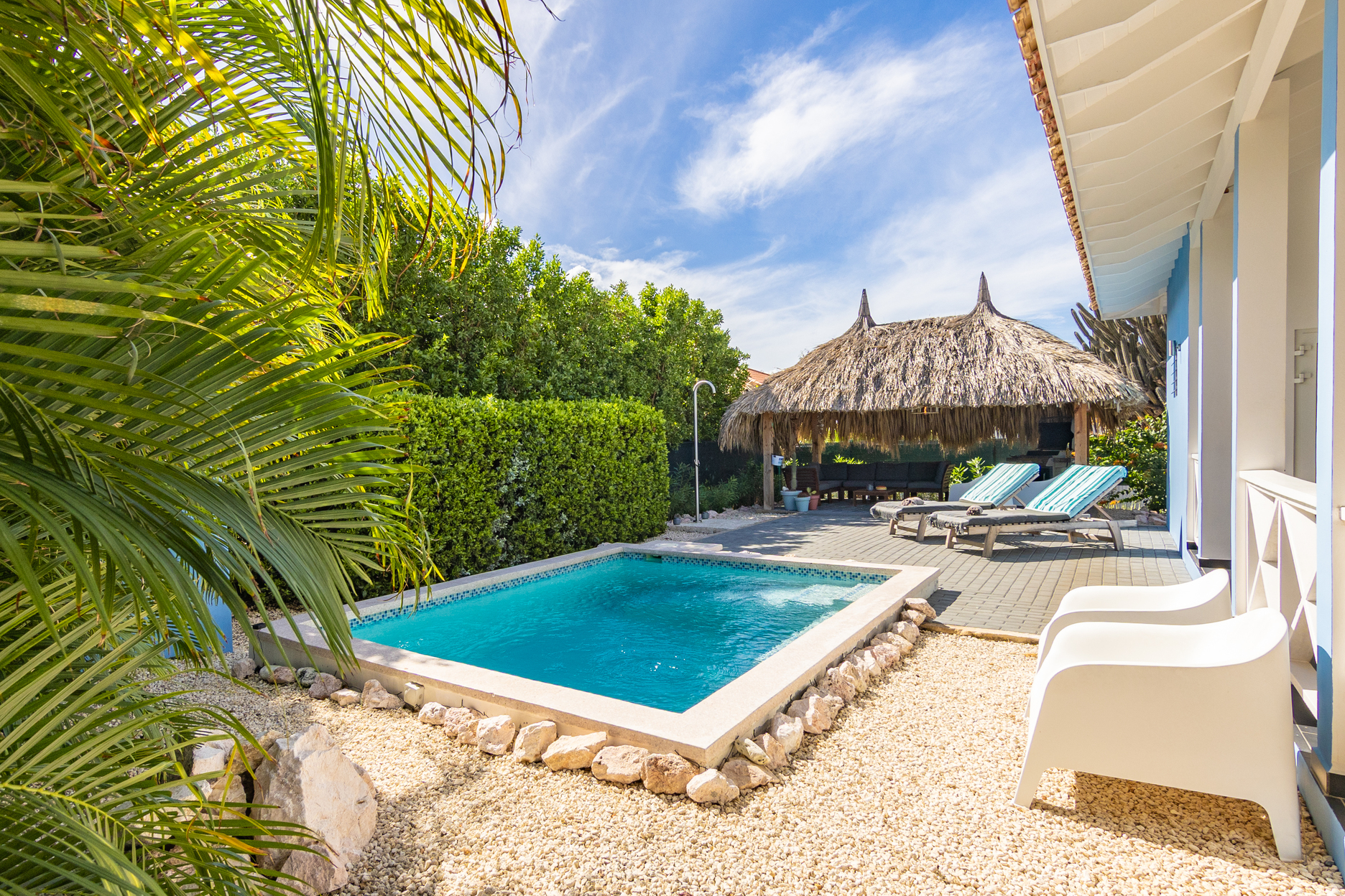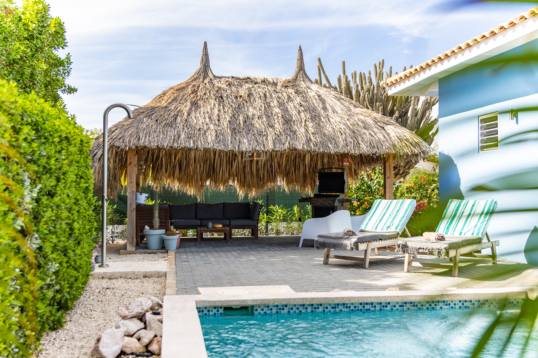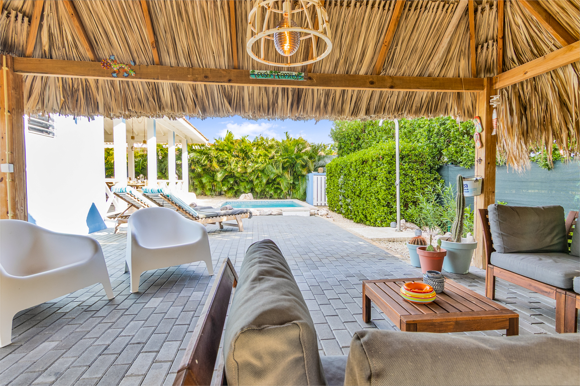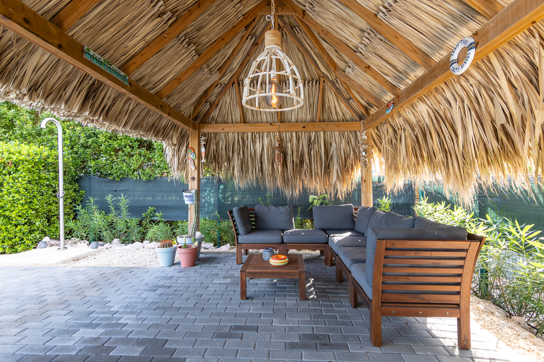 In de tuin kunt u ook heerlijk zitten op de loungebank onder onze gezellige palapa. Er staat een grote BBQ tot uw beschikking. Tevens is er een wasmachine aanwezig waar u gebruik van kan maken.
