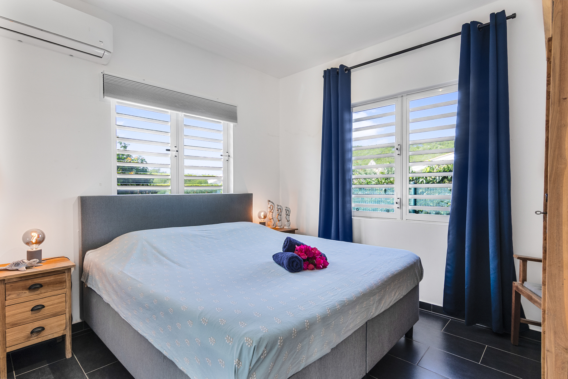 Er zijn 3 slaapkamers met airco, 2 badkamers. Alle slaapkamers zijn voorzien van boxspring bedden, 2 kamers hebben een 2-persoons boxspring en een kamer heeft 2x een 1-persoons boxspring. Het huis is voorzien van shutterramen met horren.